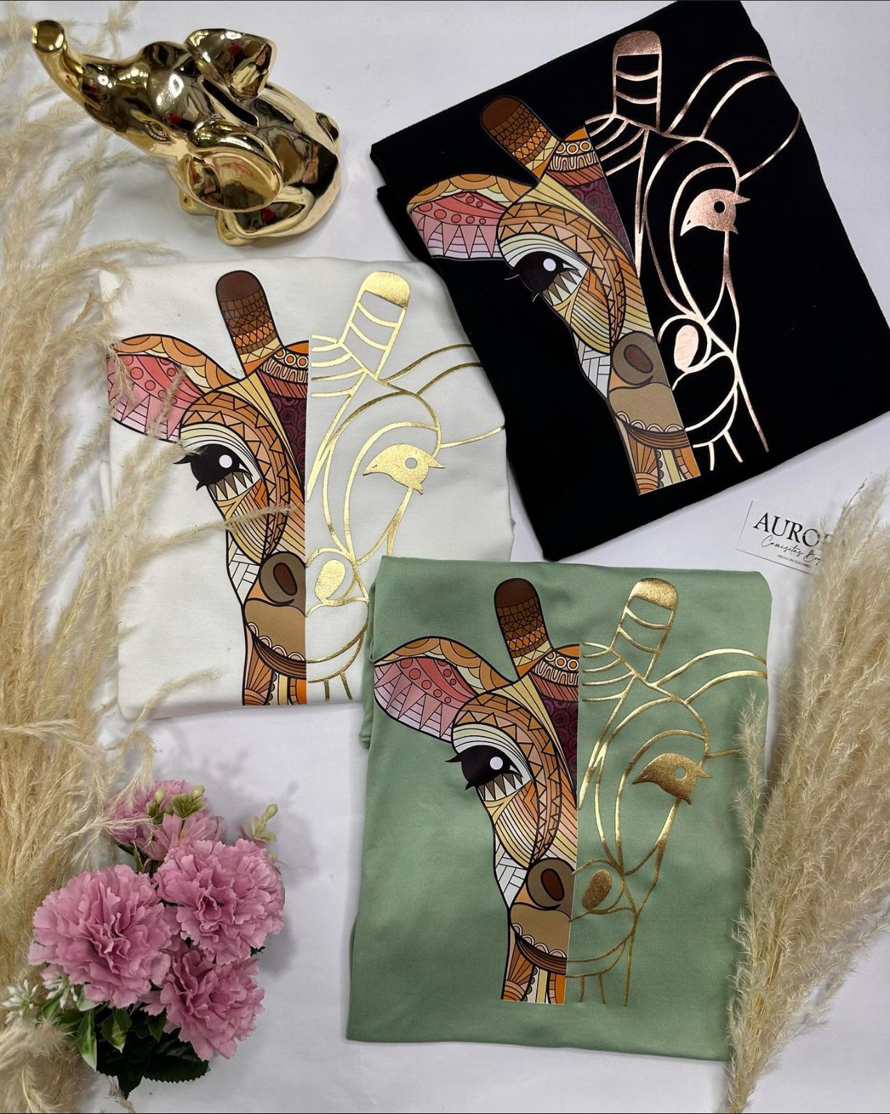 Camiseta de algodón 100% que redefine lo casual con un giro sofisticado. Su diseño estampado a media altura, con detalles dorados que capturan la luz, crea una fusión entre lo moderno y lo atemporal. Ideal para combinar con blazers o llevar sola, esta prenda es perfecta para quienes quieren destacar con un brillo sutil y un estilo único.