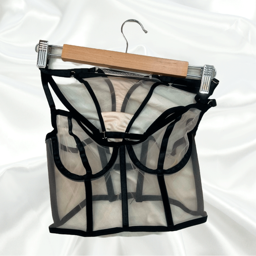 El delicado tul transparente juega con líneas estructurales negras, creando un efecto visual impactante y sofisticado que esculpe y realza. Una pieza de lencería Viju diseñada para empoderar, perfecta como secreto de confianza o como statement de estilo. Viju, la arquitectura de la sensualidad. ✨